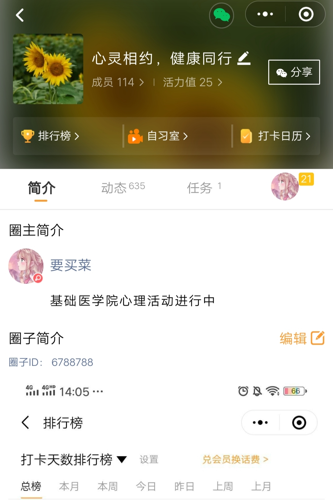 为充实研究生校园生活,增强心理健康意识,普及心理健康知识,促进大家养成良好的习惯,充满积极的能量,洋溢活泼的风采,近期,明胜m88官网采用线上微信小程序打卡方式举办了2021年“朋辈协力•心理成长”系列活动—— “心灵相约,健康同行”运动互动打卡活动。本次活动由研究生心理辅导员孙佳钰老师组织,朋辈心理辅导员赵鹤负责,全院研究生共同参加。