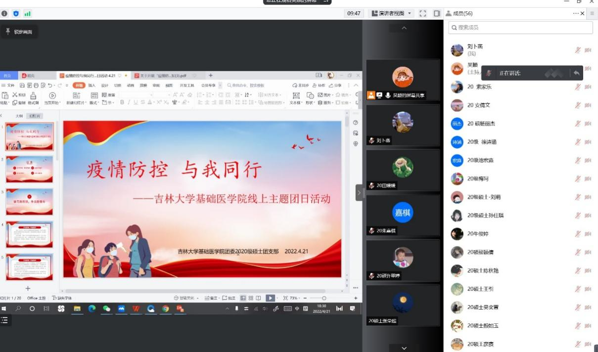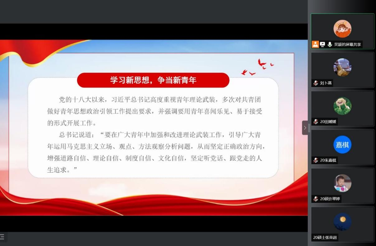 为更好地助力院校两级疫情防控工作,发挥广大青年团员主力军的作用,2022年4月12日,2020级硕士团支部在线上开展了“疫情防控,与我同行”主题团日活动。公司团委负责人、研究生辅导员孙佳钰老师以及2020级硕士全体团员参加,活动由2020级硕士团支书吴颖主持。