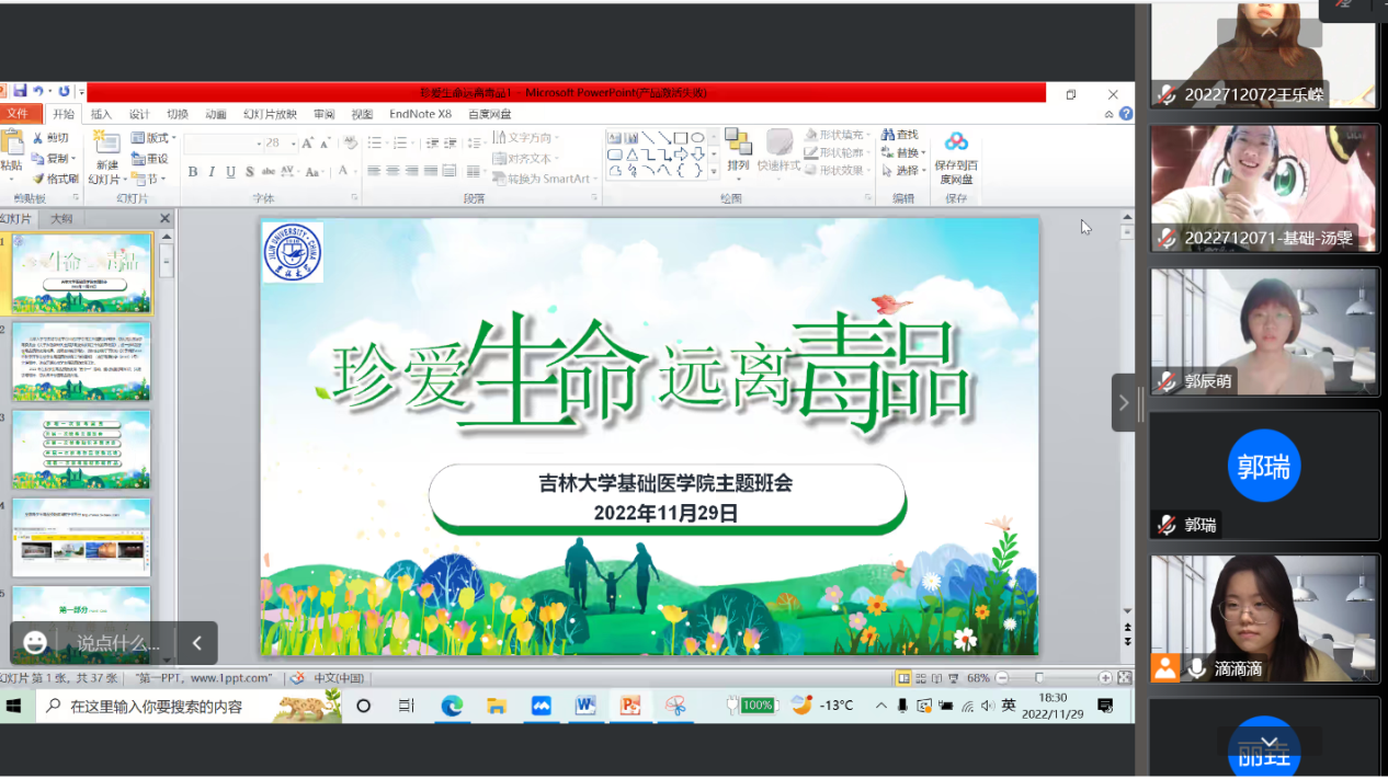 公司组织在校员工通过线上方式开展“珍爱生命、远离毒品”禁毒主题班会,普及毒品的概念、分类和特征,结合实际案例强调毒品的危害,通过播放新型毒品的科普视频了解新型毒品的伪装和危害,呼吁同学们抵制诱惑,坚决杜绝毒品。