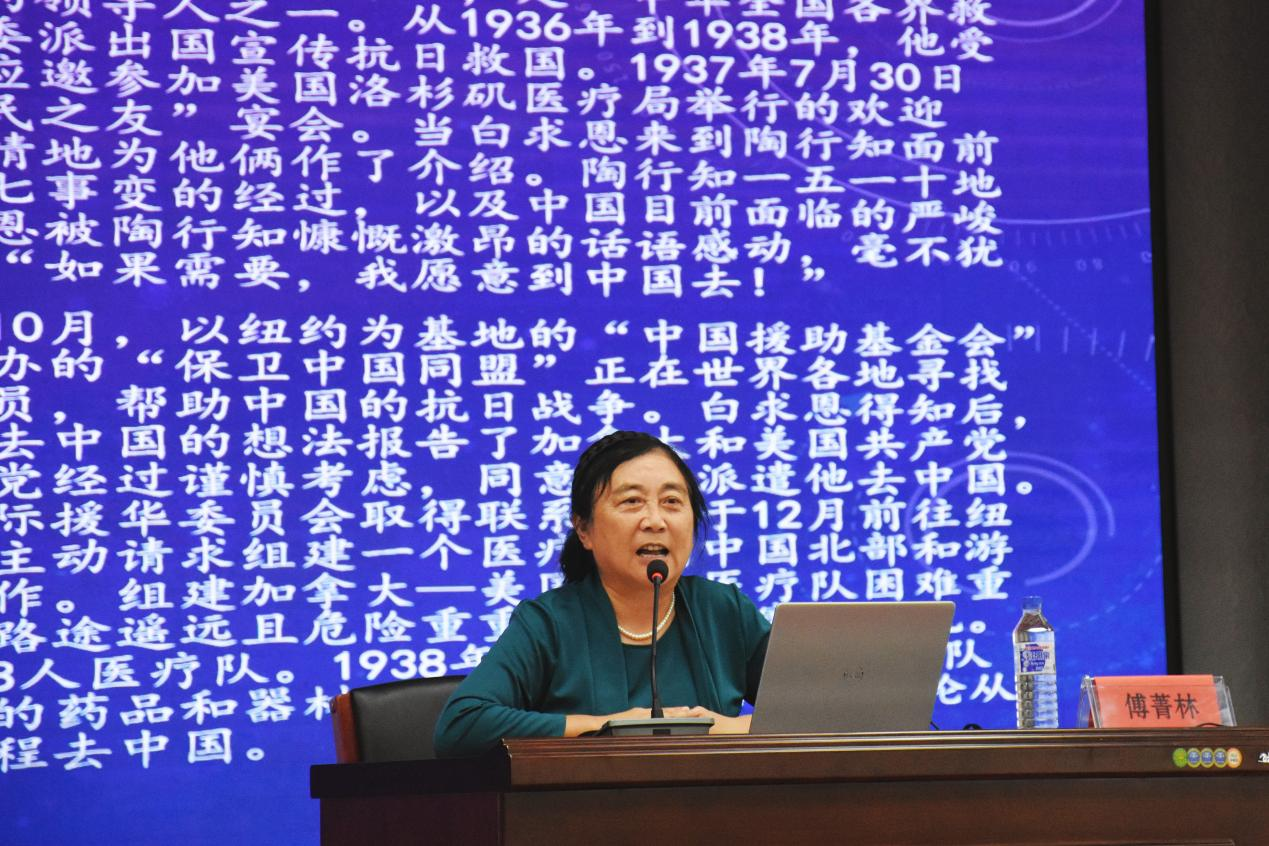 傅菁林教授从白求恩精神的内涵、白求恩精神溯源以及争做白求恩精神的传人三个方面进行阐述,分别介绍了白求恩精神是什么,它是如何形成和发展的,以及如何践行白求恩精神。她表示每一次对白求恩同志辉煌人生的回顾,每一次对白求恩同志的追忆缅怀,都是对白求恩精神的更进一步的体悟与感沐。她号召同学们,植根历史,争做白求恩精神的继承者;勇于实践,争做白求恩精神的践行者;坚定信念,争做白求恩精神的传播者。最后寄予同学们殷切期望,只要每一个白医人共同努力,白求恩精神一定会薪火相传。