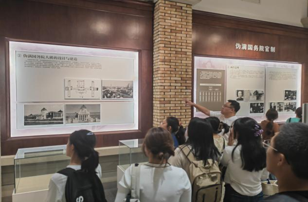 在公司党委副书记李东洋、研究生辅导员孙佳钰的带领下,参观了基础楼五楼的爱国主义教育基地一一伪满洲国警示教育展览馆。这里陈列着伪满国务院大楼的设计与建造的简介、伪满国务院官制、伪满洲国重大历史事件简编、和日本战败递交投降书的人物模型。