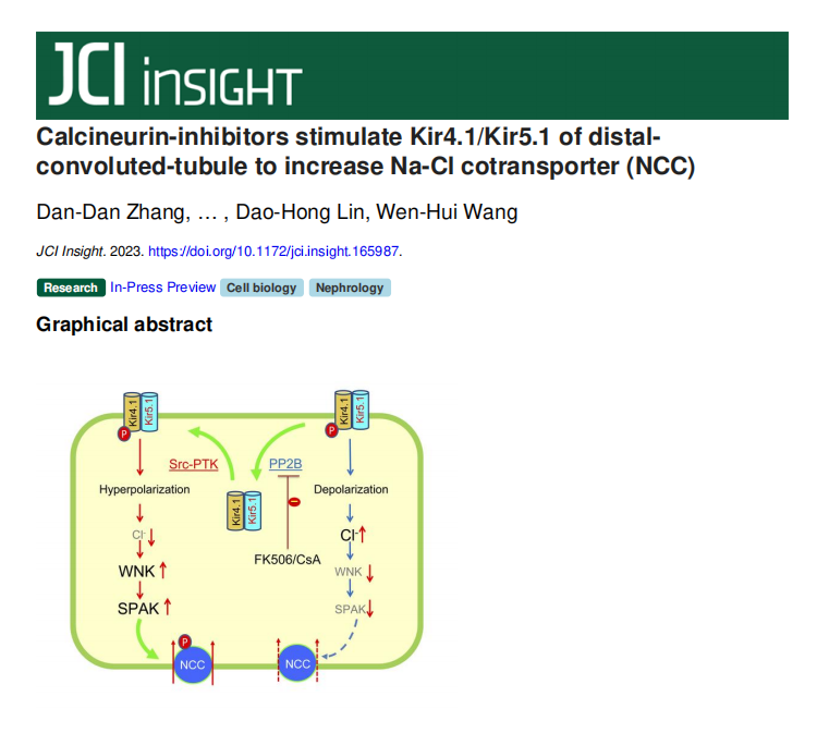 近日,公司唐敖庆青年学者,生理学系张丹丹副教授团队在中科院一区杂志《JCI INSIGHT》(IF9.484)上发表了题为“Calcineurin-inhibitors stimulate Kir4.1/Kir5.1 of distal convoluted-tubule to increase Na-Cl cotransporter (NCC) ”的研究论文。JCI Insight是由美国临床研究协会(American Society for Clinical Investigation)出版的一份同行评审的期刊,在临床前和临床研究领域具有较高的声誉,中科院JCR最新升级版分区表中,该刊分区信息为大类学科医学 1区。