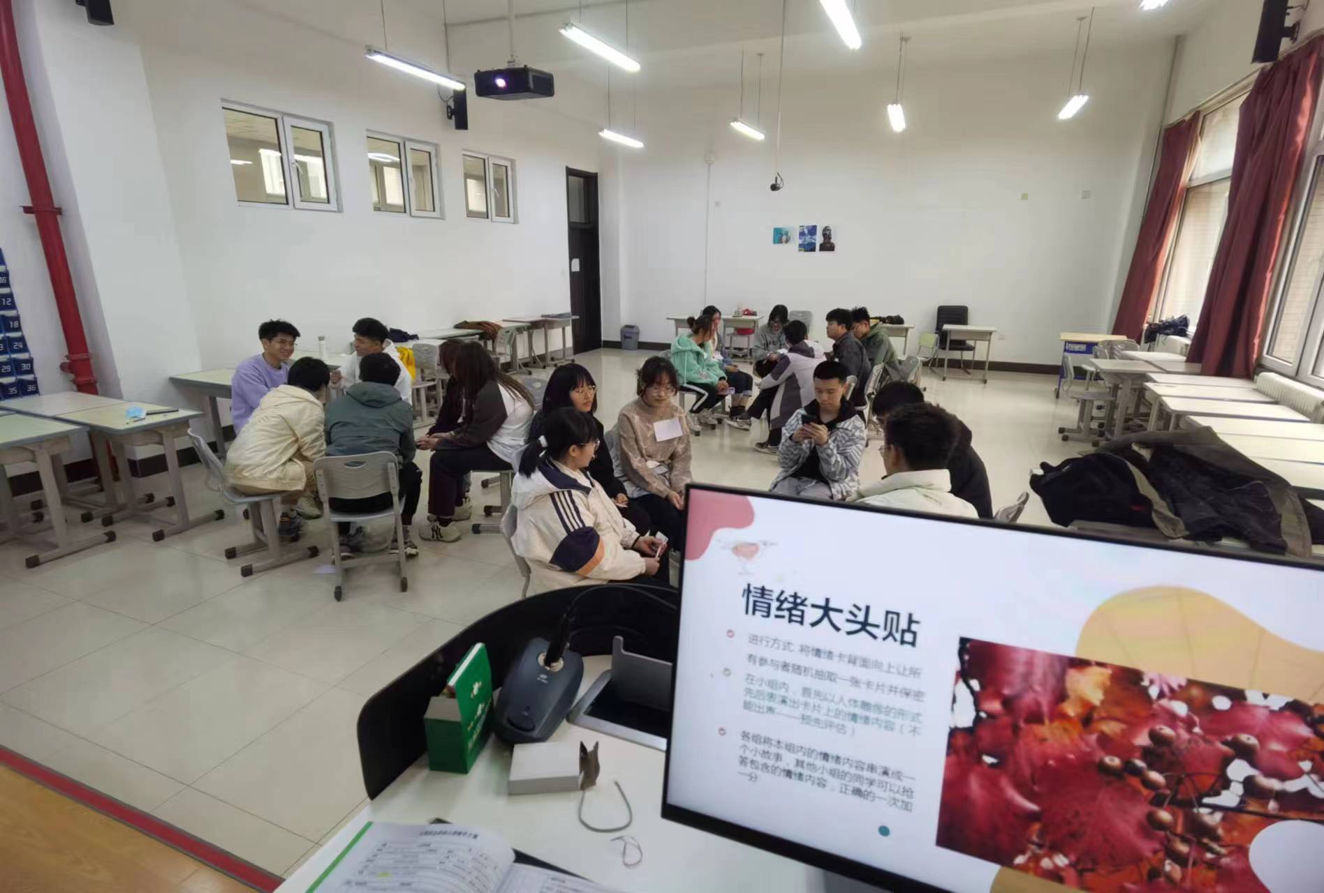 本次班会主要分为三个阶段——暖身阶段、班会阶段和结束阶段,共开展了六项赛事类活动。活动暖身阶段,由朋辈心理辅导员介绍本次班会的主题、目标、预期时间等等。让同学们在准备好的纸片上写下今天在活动中的名字并将其放在身上明显的位置上,活动过程中将代替真实姓名,增加了活动的趣味性。参加活动的同学分为三组,首先本次班会的第一个暖身小活动——情绪大头贴,在本轮活动中,同学们积极参与,集思广益,分别以小故事的形式展现出了“骄傲”“恐惧”“羡慕”“沾沾自喜”等情绪,现场气氛活跃。