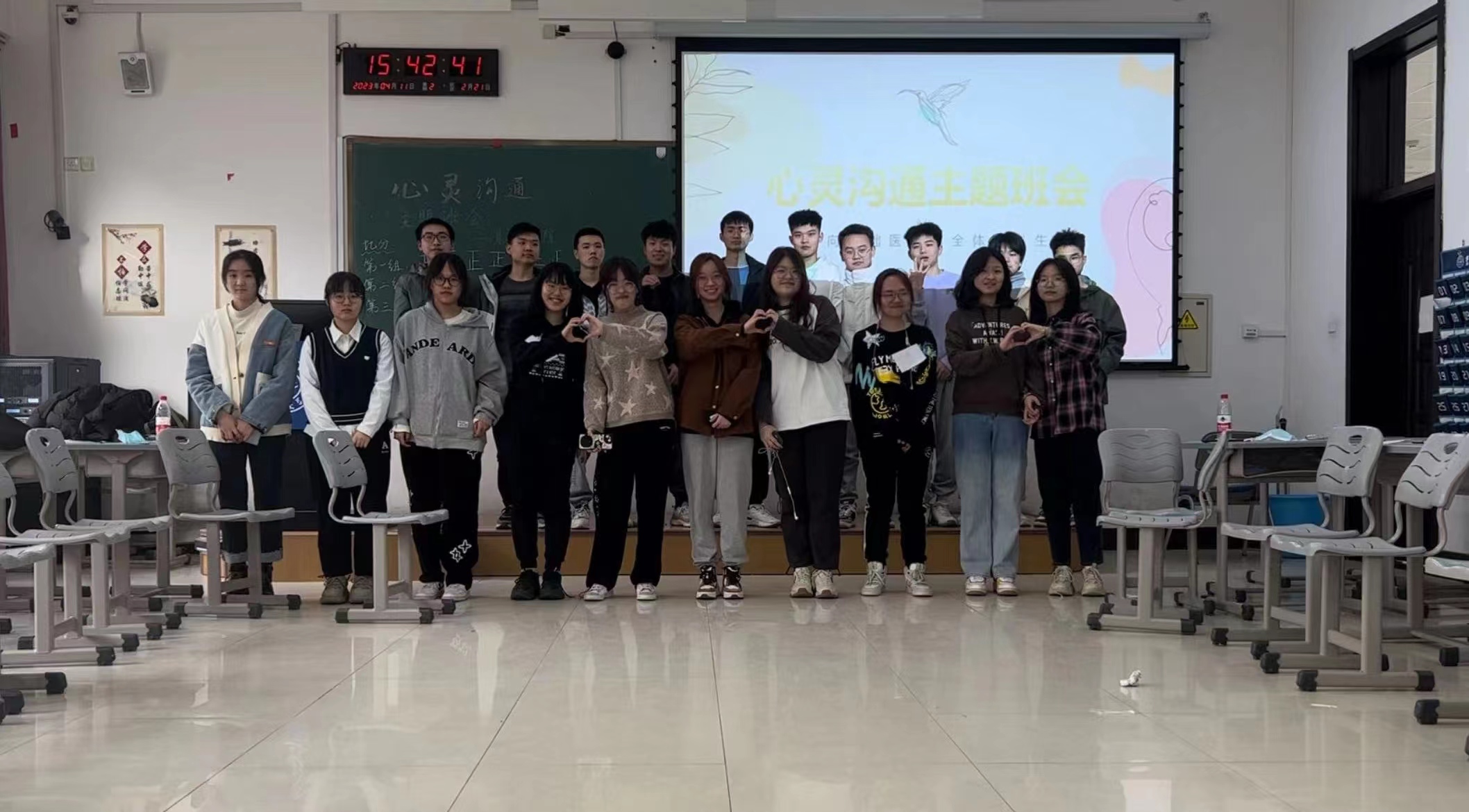 为进一步促进班级成员的互助意识和情绪管理能力,增强员工人际交往能力。2023年4月11日,明胜m88官网全体本科生在心理健康指导中心指导下,学办主任李东洋和朋辈心理辅导员朴炫旭的带领下,在李四光楼214教室开展了“心灵沟通”主题班会。