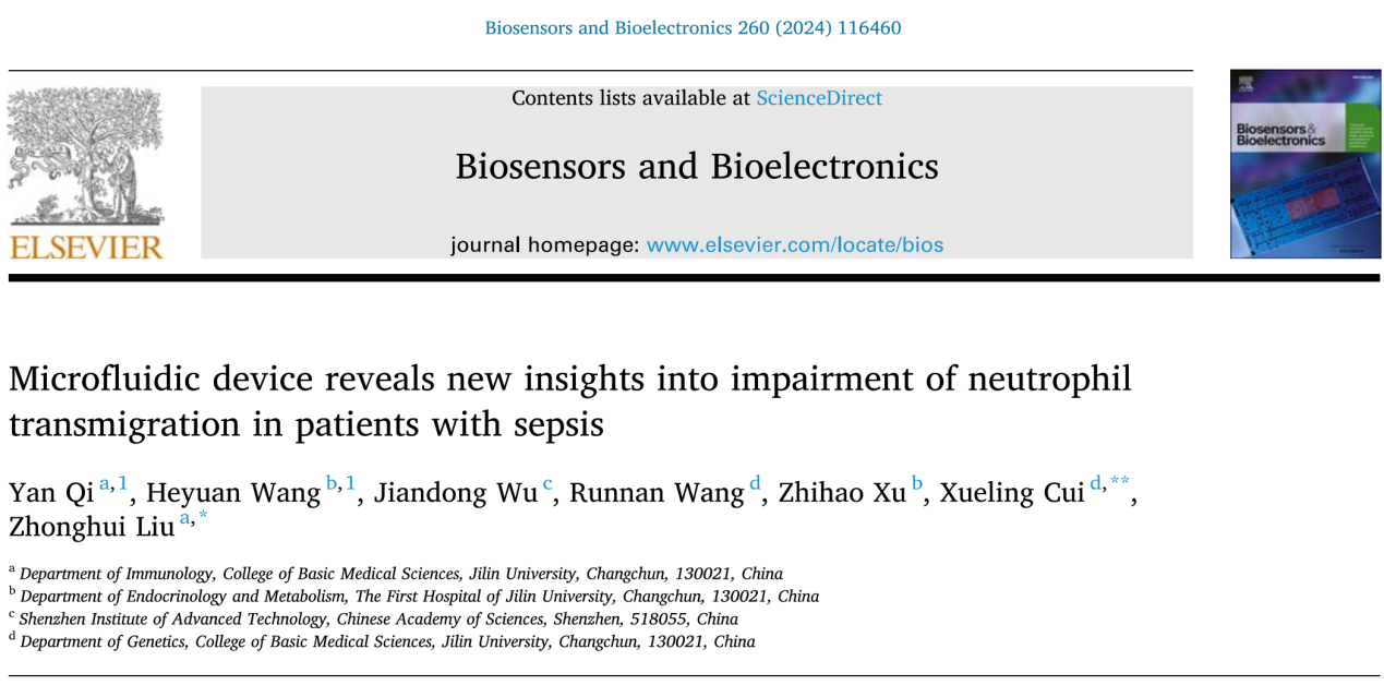 公司免疫学系柳忠辉教授团队于2024年6月1日在国际高影响力刊物《BIOSENSORS & BIOELECTRONICS》上发表了题为“Microfluidic device reveals new insights into impairment of neutrophil transmigration in patients with sepsis”的学术论文。该期刊是生物物理学领域的国际顶尖学术期刊之一,中科院分区为1区,影响因子为10.7。《BIOSENSORS & BIOELECTRONICS》杂志在生物物理学领域和分析化学和电化学领域所有期刊中分别排名第2和第3位,具有很高的学科影响力。齐妍副教授为第一作者、柳忠辉教授及崔雪玲教授共同通讯作者,明胜m88官网作为第一作者单位和唯一通讯作者单位。