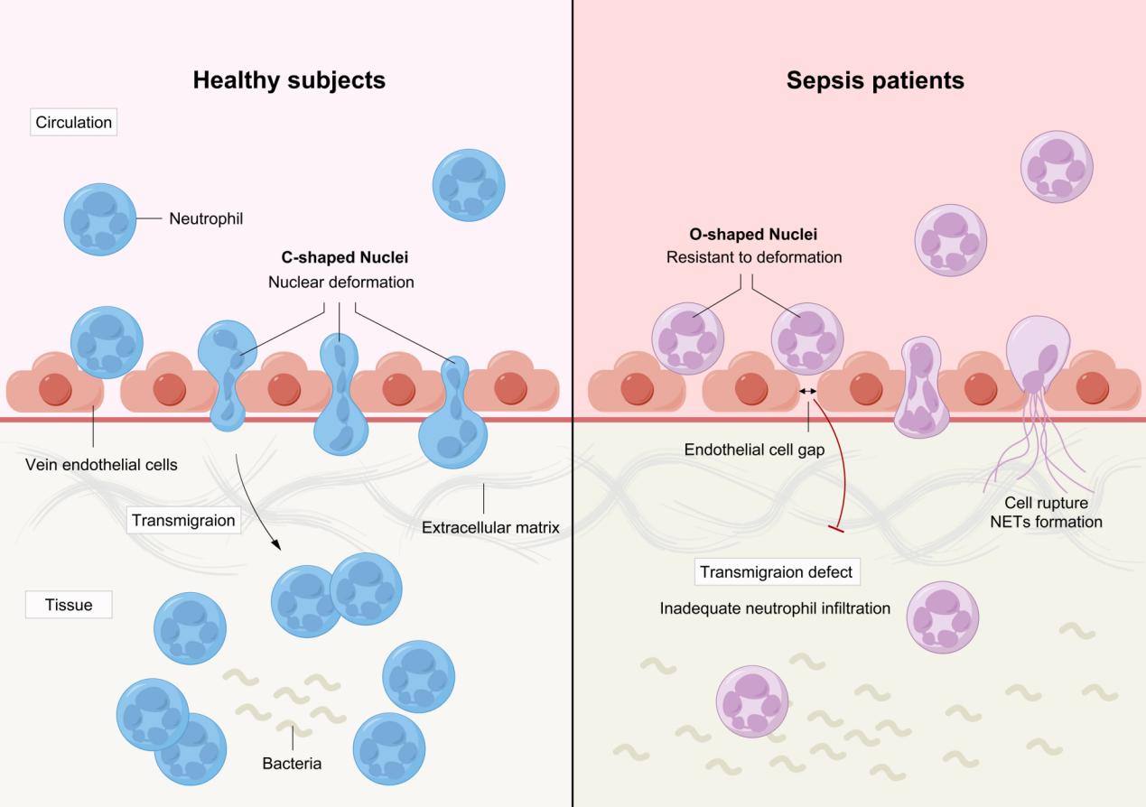 研究利用具有微米级窄缝的微流控装置模拟体内生物障碍,能够实时观察并记录中性粒细胞穿越障碍时的迁移和核形变过程。此外,该研究还开发了一种新的形态分析方法,对大量单个中性粒细胞的核形变进行了定量分析。研究发现,健康人的中性粒细胞能够灵活调整其核形状以穿过狭窄的通道,而脓毒症患者的中性粒细胞核形变能力下降,难以通过5μm以下的狭窄间隙,且在压力下更容易破裂。这项研究为中性粒细胞迁移缺陷提供了新的视角,强调了核形变能力在细胞迁移缺陷中的关键作用,为临床诊断和治疗策略提供了新的视角和方法。