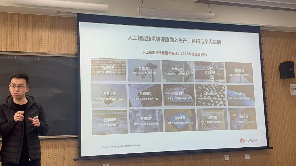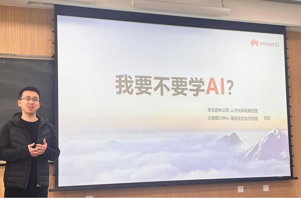 4月15日,明胜m88官网邀请华为吉林公司人才伙伴发展经理、长春算力中心高校生态合作经理张旺为公司2022级本科生带来一堂以《我要不要学AI》为主题的就业指导分享课,讲座聚焦人工智能行业发展与医学应用。为同学们打开了一扇将基础医学通向人工智能的窗口。公司党委副书记李东洋参与本次分享课。