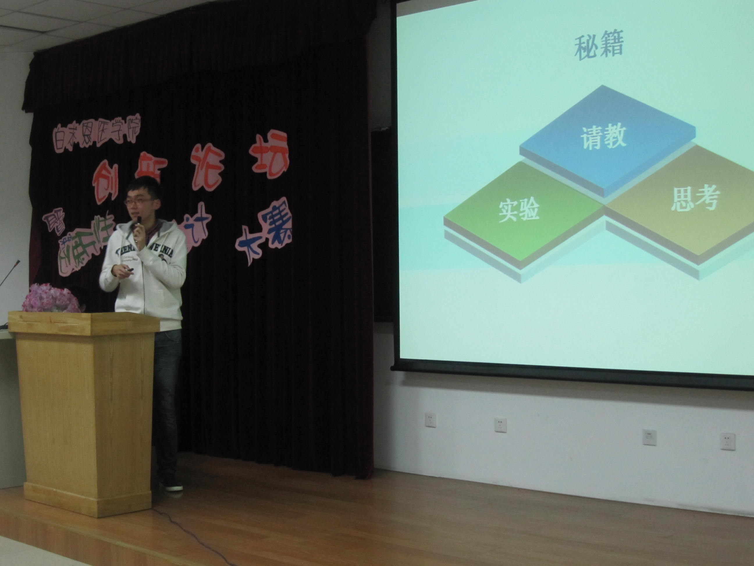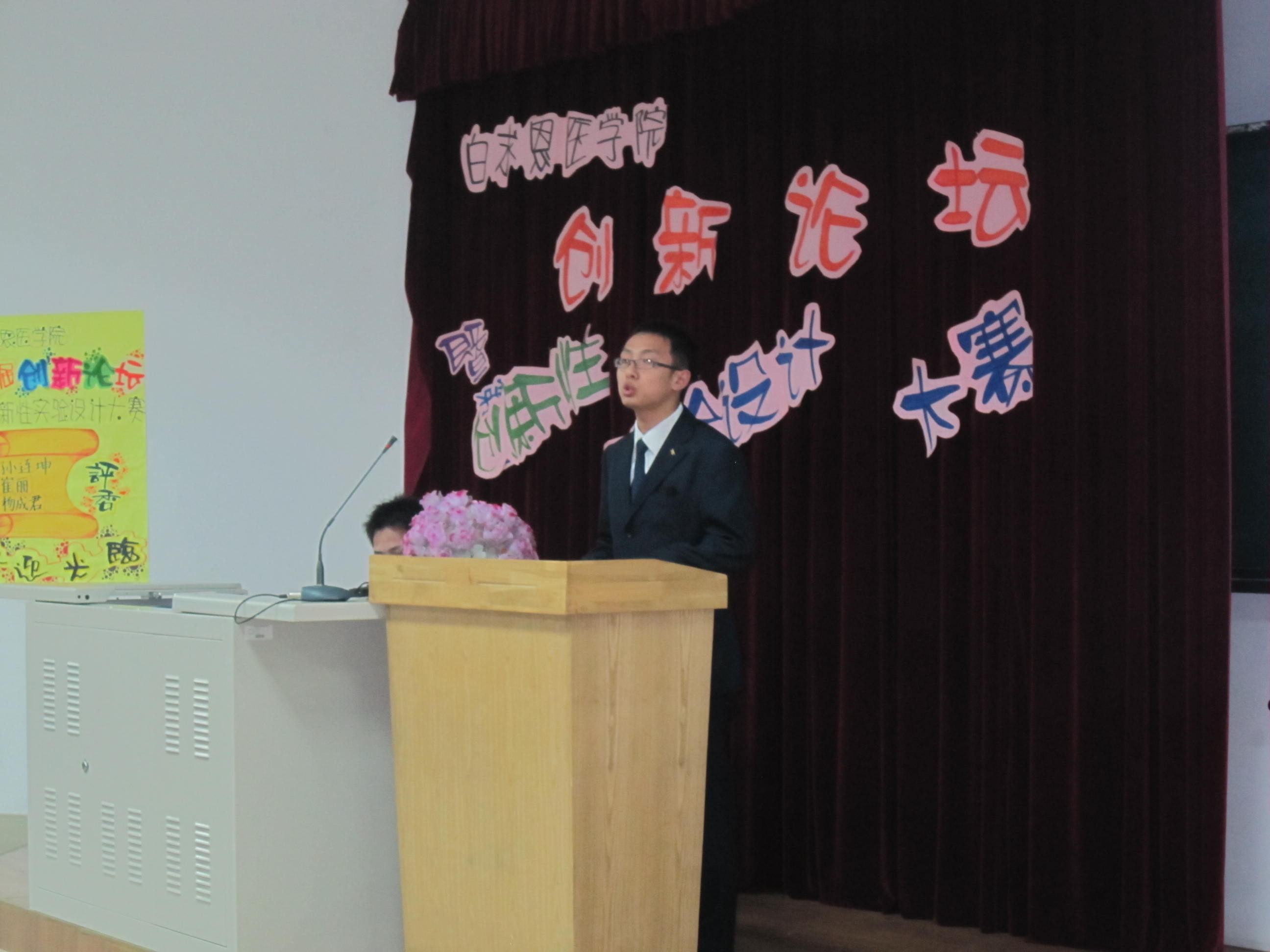 首先,白求恩医公司员工会主席刘兴任致开幕辞,他号召全体同学掌握扎实的基础,提升创新的思维,插上创新的翅膀自由飞翔。随后,经过初赛选拔出的五位选手分别就“特异性的激活和抑制水通道蛋白及氯离子对喉癌细胞的凋亡影响”、“抗体进入细胞核内会怎样”、“钙离子在皮肤修复中不可缺少,探究最佳促使皮肤修复的钙离子浓度,减少修复型保湿剂对皮肤的损伤”、“木香提取物治疗急慢性胃溃疡”、“通过提取丝氨酸蛋白酶中的有效结构域,对味觉中影响咸味的传导机制进行调控,从而达到减少食盐摄入量、控制高血压的目的”五项内容进行了阐述。选手们分别从背景资料、实验设计、结果预期和未来展望几个方面进行论述后,评委们进行了提问。选手们或慷慨自信的进行实验设计陈述,或虚心谦逊的接受评委老师的指导。现场的观众也积极参与,提出自己的疑问,与参赛选手进行交流。最终,由徐永明、董航、刘轶组成的团队获得一等奖。