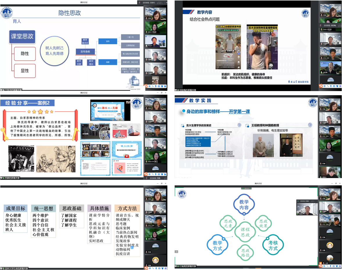 在汇报与分享交流阶段,十位教师结合各系学科特点,向参会的专家和老师们分享了疫情期间课程思政的教学设计与教学效果。病理学系的王医术教授分享了 “疫期《病理学》课程思政的实践与思考”,通过介绍病理学课程蕴含的隐性思政和显性思政,以大爱为基础,以大德为中坚,以大智为核心,实现无声融思政,有声育英才。组织学与胚胎学系刘佳梅教授汇报了“同新战役,同屏共振的思政分享”。通过介绍组织学与胚胎学系通过优化教学内容、创新教学方法、创新考核评价体系,实现了课程思政教学效果的新高度。病理生理学系的苏静教授分享了“基于员工自驱力的思政元素设计策略”,让大家了解到病理生理学课程通过“简”以突出重点、“通”以凸显员工、“推”以强化能力、“拔”以培养卓越,实现了课程思政的无声融入。生理学系的葛敬岩教授分享了“融情入理,潜心育人”,通过介绍生理学系的开学第一课设计,为员工讲授身边的故事和榜样,展开生理学系的教学内容,将思政元素在第一课渗入到全部的课程学习中。药理学系的石卓教授分享了 “坚定信念,实时思政——药理学系课程思政情况汇报”,层层递进、环环相扣的教学设计,为我们展示了药理学课程思政安排的创新与巧妙。免疫学系的付海英老师分享了“无声育人,有声花开——医学免疫学课程思政实践与思考”, 通过介绍思政元素挖掘、思政路径设计、课程思政实施以及思政效果展示,体现了免疫学课程的育人无声、花开有声。生物化学学系的张纪周老师分享了“脚踏实地,思政育人——生物化学课程思政元素挖掘”,生物化学学系以本学期的线上教学抗疫宣讲和教学设计为例,通过真实性、趣味性、同理性、时效性以及新奇性展示了生物化学课程的育人细无声。分子生物学系的王华老师分享了“医学分子生物学课程中思政元素的渗透与融合”,通过介绍分子生物学的学科特点、从科学史中挖掘出课程思政元素以及如何将思政元素与学科特点有机融合,展示了分子生物学课程思政的设计与感悟。解剖系的刘辉老师分享了“追思感恩,责任担当,隐性思政,润物无声”,让我们了解到解剖学作为特殊的一门课程,教师在授课的同时,教会了员工如何尊敬和感恩大体老师,学系在积极投身教学的同时,也努力种好了课程思政责任田。细胞生物学系的何海涛老师分享了“医学细胞生物学课程思政的建设与实践”,通过教学理念、教学策略、教师培训与实践以及教学成果四个方面的介绍,展示了细胞生物学的思政设计。