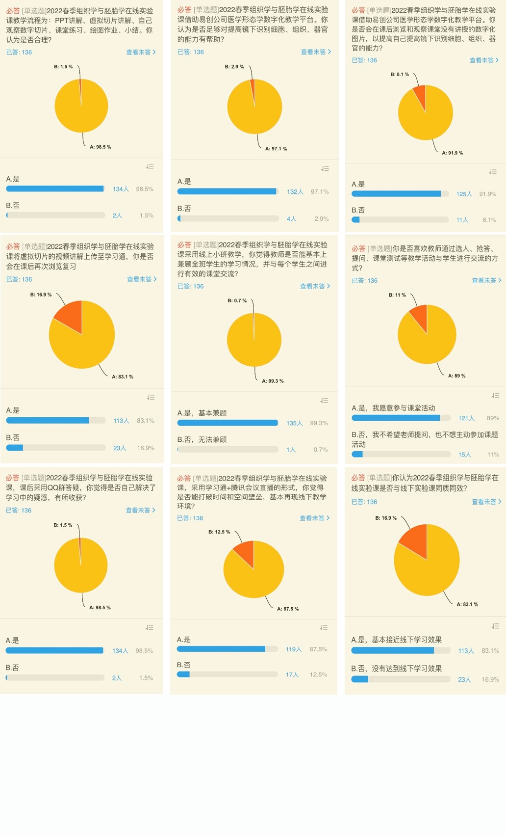 及时教学反馈,倾听员工心声。目前,组织学与胚胎学实验线上云课堂已经运行了1个月,为了了解员工的学习动态和心声,学系进行了教学反馈问卷调查。调查结果(见附图)显示,绝对多数的同学认可2022春季组织学与胚胎学在线实验课教学,对授课效果、教学安排、教学方法、教学模式和班型设置的认可度较高,并且能够充分利用引进的医学形态学数字化教学平台和学系自建的虚拟切片讲解进行课堂学习和课后复习。授课教师通过多种形式与员工互动和课后QQ辅导,充分兼顾每个员工的学习情况,帮助员工解决疑惑,同时通过课前5分钟的抗疫宣讲,帮助员工坚定了抗疫必胜的信心,安抚了员工的情绪,稳定地保质保量完成教学任务。
