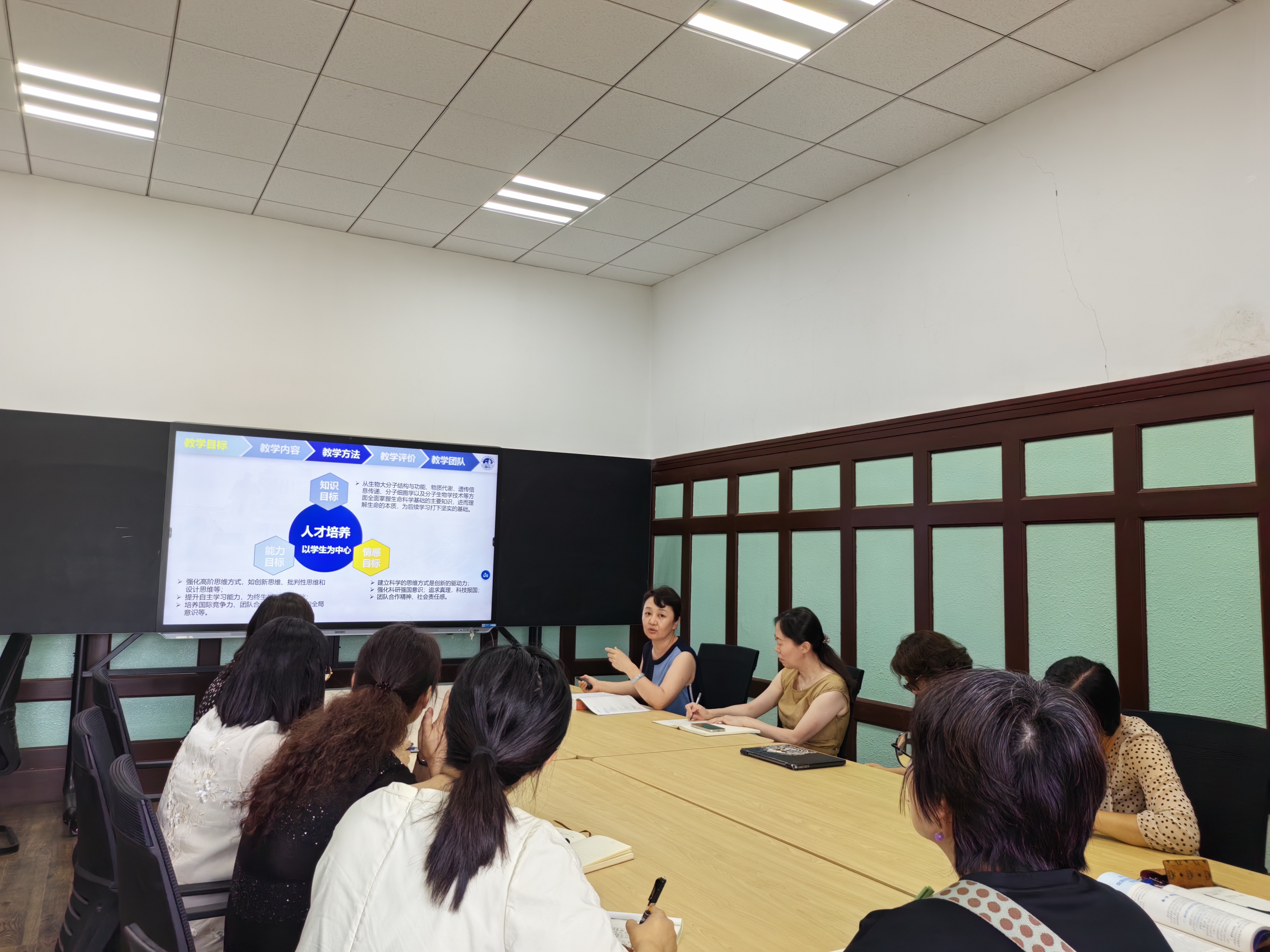 《生命科学基础》课程负责人阚慕洁老师分别从教学目标、教学内容、教学方法、教学评价、教学团队六方面介绍了课程相关情况,并详细阐述了课程六大模块的内容设置和学时分配情况。她建议老师们充分利用暑假假期进一步完善授课准备,完成学习通线上章节构建和教学资源整合。课程授课教师在开课前需完成授课课件、章节重难点视频以及课程试题库的制作、收集和上传;在教学过程中教师需要按模块布置作业,对员工进行章节测验并批阅,了解员工课程学习情况,及时调整教学计划和教学方法。随后,课程团队教师对教学内容、教学设计、教学方法等方面展开了热烈的讨论。最后,辛颖教授对本次备课活动给予了充分肯定,她建议将前沿进展相关研究文献引入课堂,进一步丰富线上拓展资源,引导员工运用思维导图构建课程知识体系框架。