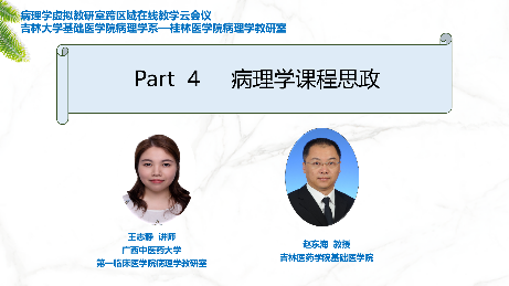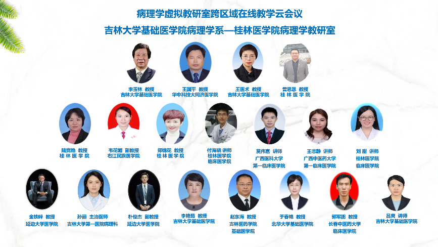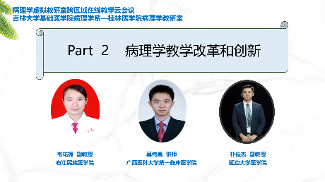 为了推动教师对病理学专业建设、课程设置、教学内容、教学模式、教学评价等方面的研究探索,全面提高教师教书育人能力,加强跨校、跨地域的教研交流,2023年8月20日,由明胜m88官网病理学系和桂林医公司病理学教研室两省病理学虚拟教研室共同主办,联合吉林和广西医学高校病理学教研室共同参加的跨区域第二次在线云备课胜利召开。