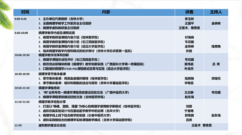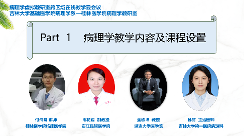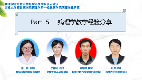 桂林医公司、右江民族医公司、广西医科大学第一附属医院、广西中医药大学、延边大学医公司、北华大学、长春中医药大学、吉林医药公司以及m88官方网站的病理学教研室共十四位教师对各自教研室在病理学教学内容及课程设置、教学改革和创新、集体备课、课程思政及教学经验分享等五大方面进行了全面、细致的介绍。