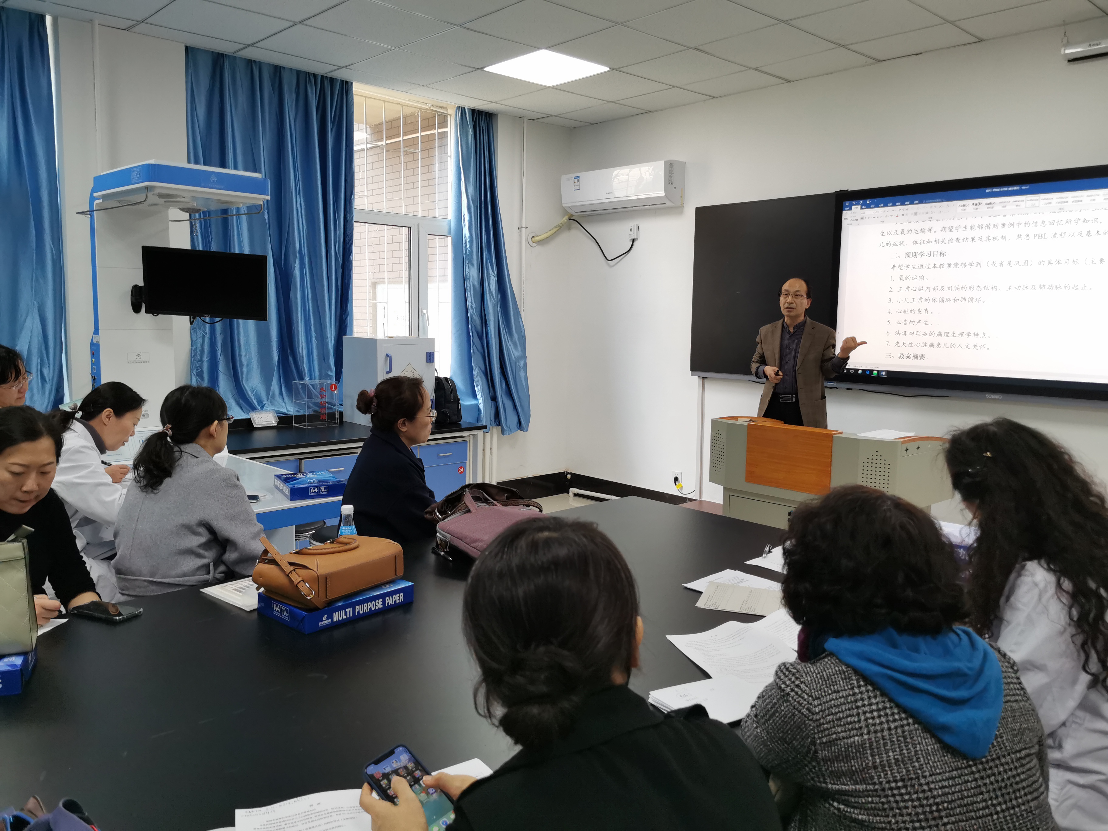 集体备课活动中,李洪岩教授为大家详细讲解了PBL教学中第一个案例的带教要点。从案例的第一幕开始逐幕介绍,针对案例情境涉及到的知识点如“氧的运输、正常心脏的发育及形态结构、小儿正常的体循环和肺循环、法洛四联症的病理生理学特点”等进行了讲解。对如何引导员工开展深入的关于机制的讨论、如何在员工讨论过程中适当地提出提示性问题、如何将人文关怀、职业素养等思政元素融入教学等内容及既往员工讨论中经常出现的问题进行了介绍。靳英丽老师与大家共同回顾了PBL授课的整体流程、教学档案管理的要求及注意事项,参会教师们根据以往的授课体会积极地提出一些建议。