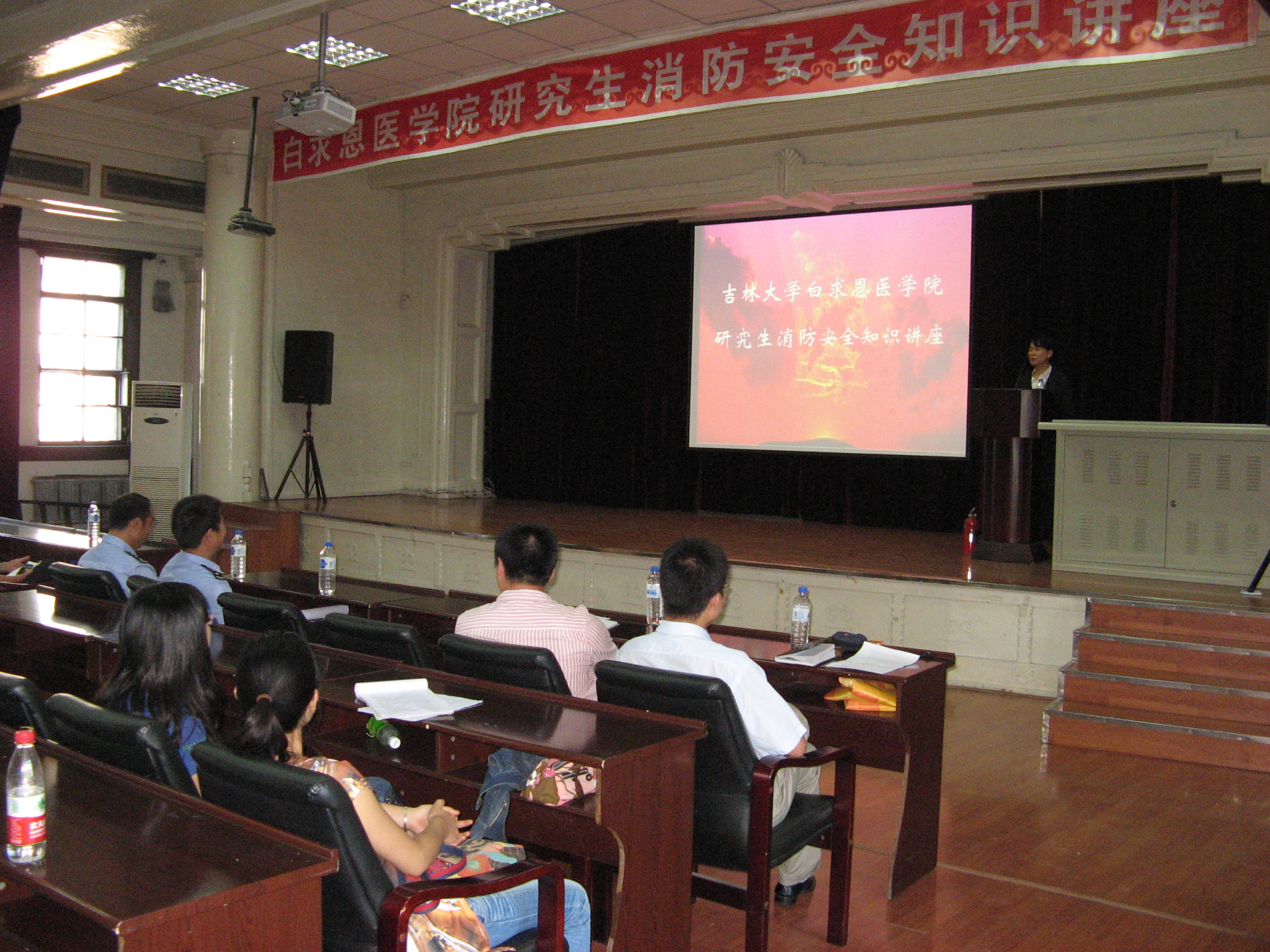 8月31日下午,白求恩医公司邀请新民校区保卫办科长安志成老师和郭云秀老师在基础二楼多功能报告厅为2010级研究生新生进行了消防安全知识讲座。公司党委副书记费淑波、研究生办公室主任陈野、新民校区保卫办两位老师和2010级全体研究生共同听取了此次讲座。讲座由公司研究生会主席杨晓春主持。