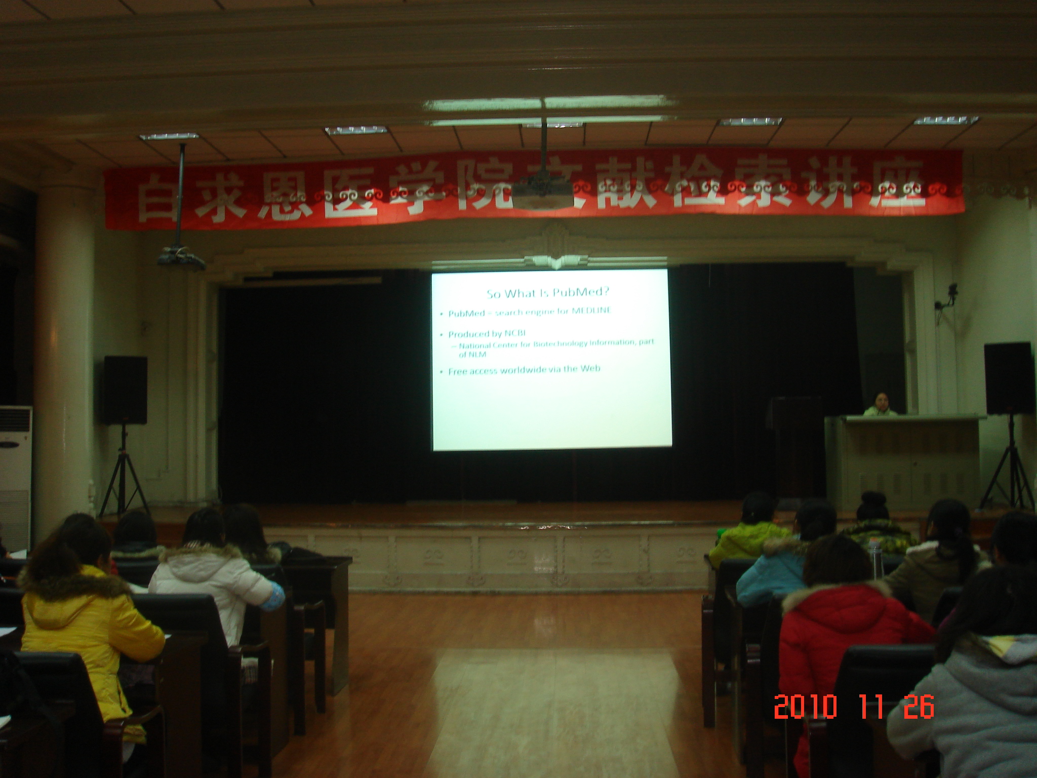 11月26日晚,在基础楼二楼多功能学术报告厅,白求恩医公司研究生会邀请公共卫生公司信息管理教研室王丽伟老师进行了一场文献检索的专题讲座。公司党委副书记费淑波、研究生办公室主任陈野和2010级研究生一起参加了专题讲座。研究生会学术部长刘婷主持了讲座。