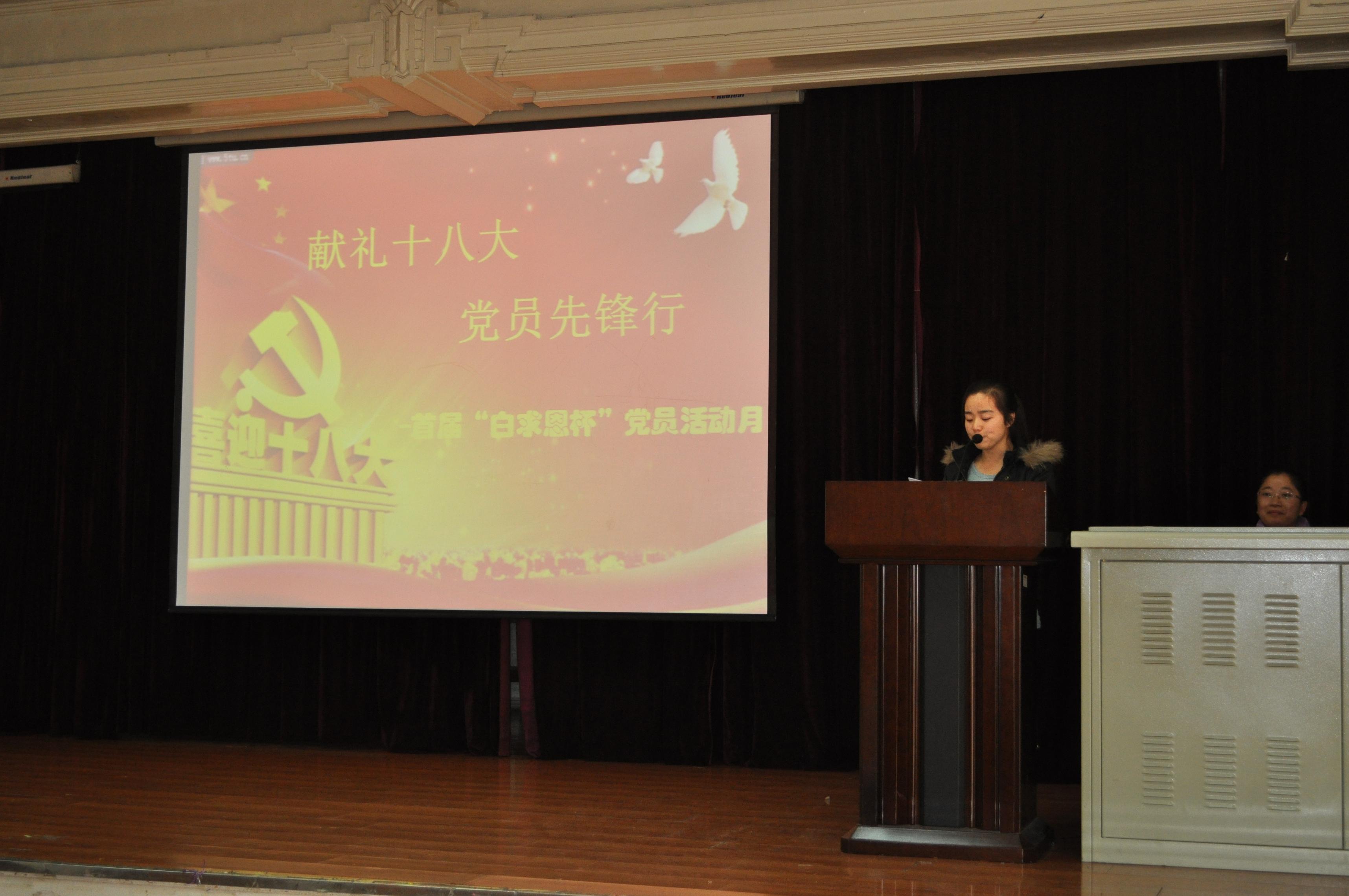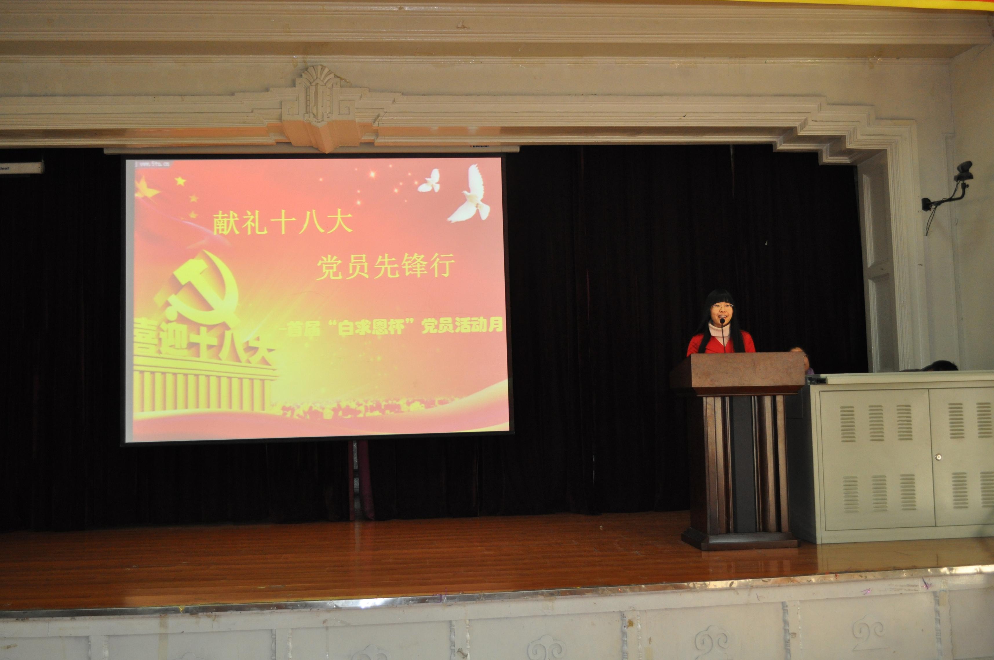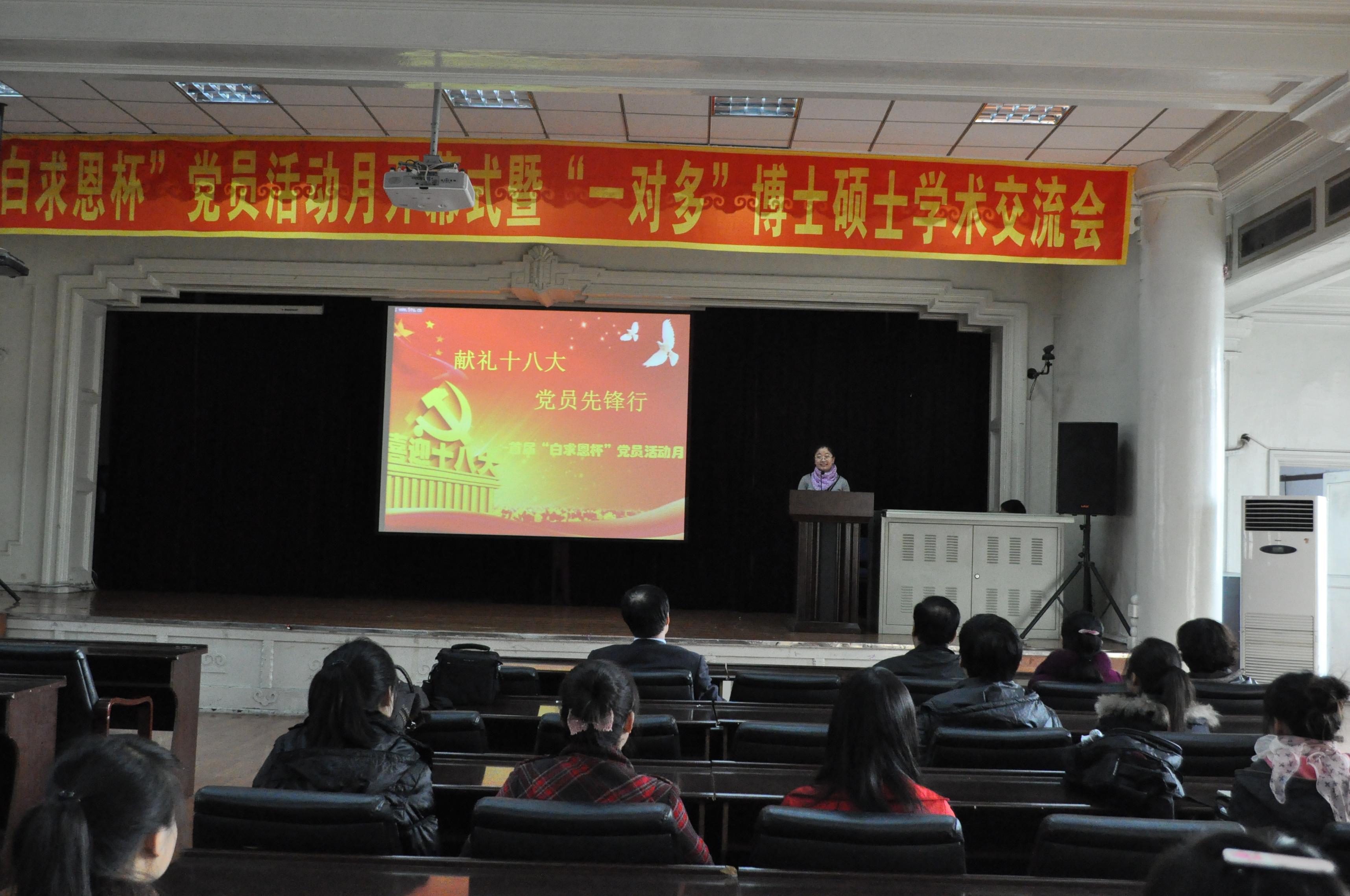 为迎接十八大的胜利召开,11月8日上午,白求恩医公司2012级硕士、博士党支部主办的“献礼十八大,党员先锋行”系列活动之首届“白求恩杯”党员活动月开幕式暨博士硕士学术交流会在基础楼二楼多功能学术报告厅举行。公司党委书记屈英和、副经理李一雷、党委副书记费淑波、研究生办公室主任黄梅和2012级博士、硕士党员及同学一起参加了开幕式。开幕式由2012级硕士党支部书记张钰主持。