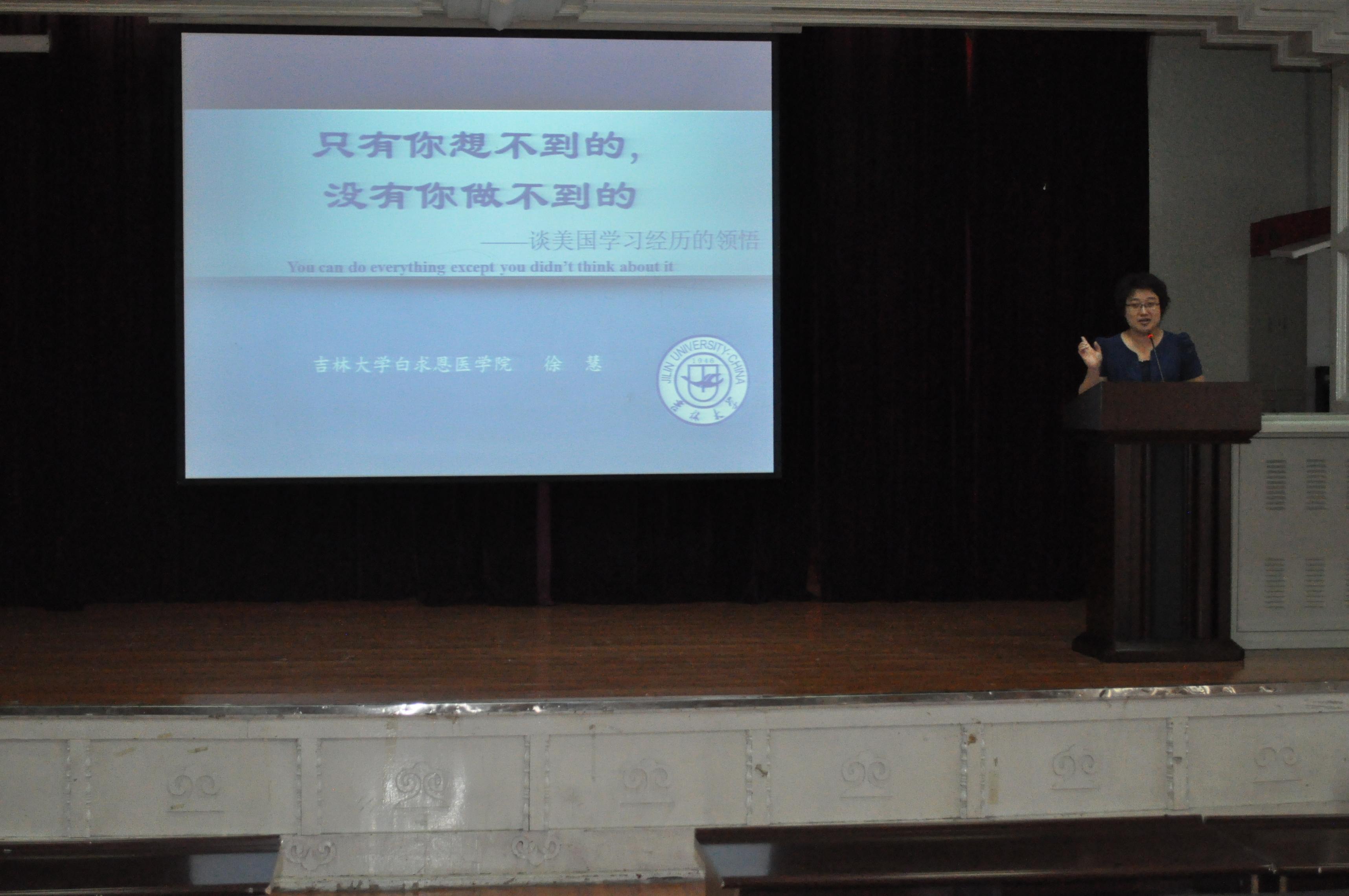 8月31日下午,白求恩医公司邀请了2011届优秀博士毕业生-—于慧美、徐慧在基础楼二楼多功能学术报告厅进行了研究生学术经验报告会。白求恩医公司主管研究生工作副经理李一雷、党委副书记费淑波和2012级研究生新生一起参加了报告会。报告会由研究生办公室主任黄梅主持。